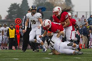 With an executed three-headed ground attack to chew up time and cover ground, the Boxers overcame the Bruins on Nov. 7, 34-20. (Top) Junior Andy Harris and senior Trey Kodama led the defense with 10 tackles each. Junior Andy Harris (left) makes the tackle. Senior Greg Alip (right) added 34 rushing yards as the home team ground out a season best of 236 rushing yards. At the final home game of the year, the team clinched its third winning season in a row. Pacific will end the 2015 season next Saturday, Nov. 14 at Puget Sound, a team that also has clinched a winning season at 5-3.