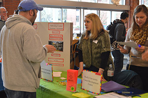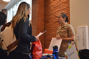 Employers, recruiters and representatives from local and national organizations lined the University Center Feb. 5. A transfer student speaks with the Advising Center and Career Development center about getting connected to on campus jobs (top). The fair drew in a large net of off-campus recruiters, including army recruiters (bottom). Students attended the event to get work- study jobs, get connected to volunteer work and find recruiters for post-graduation work. The career development center hosts a work and service fair every fall and spring.